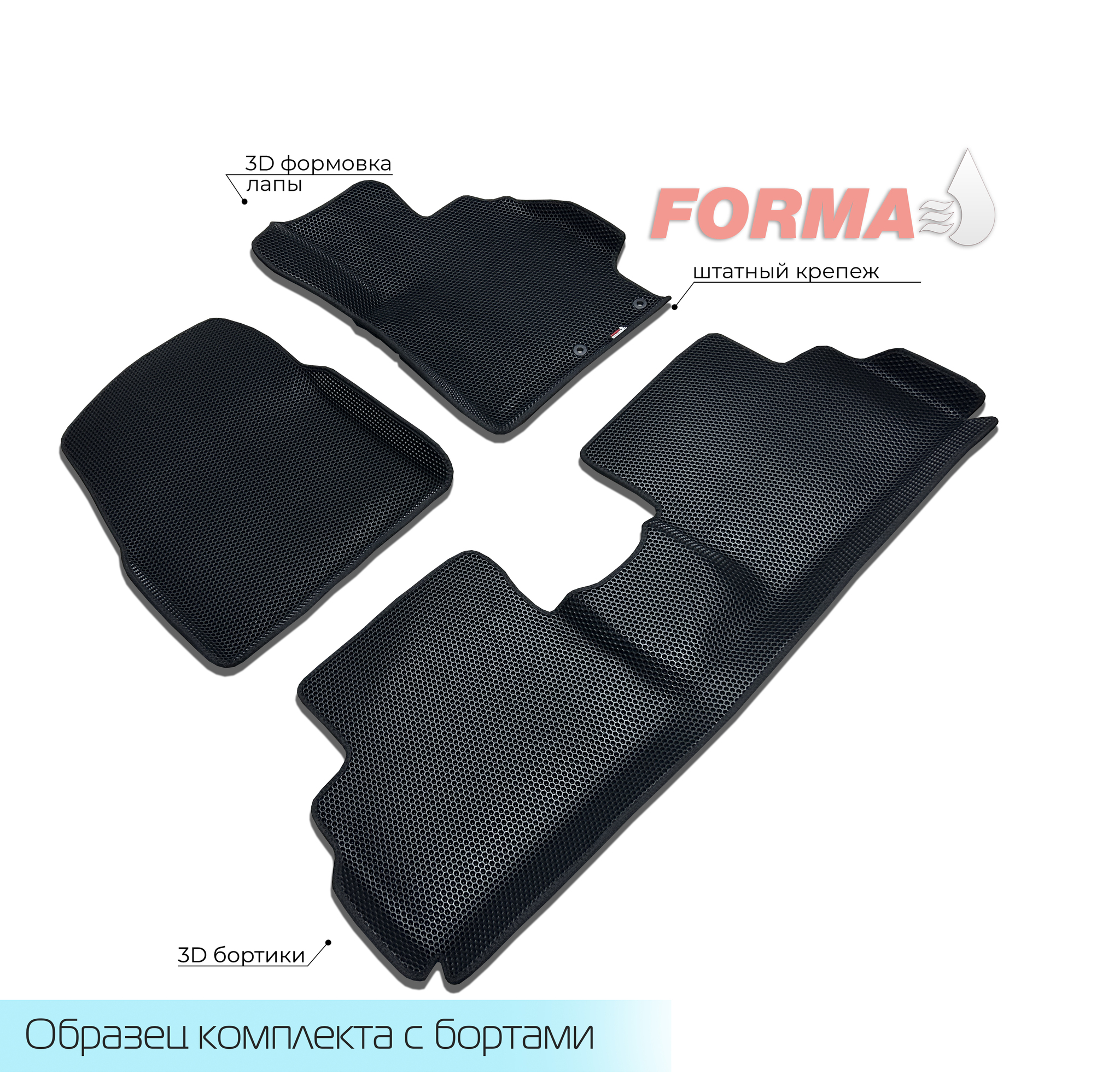 При производстве ковриков от компании FORMA, используются высококачественные сертифицированные материалы и свои собственные лекала, снятые непосредственно с автомобиля. Коврики надежно крепятся к полу при помощи липучек и штатного крепежа, при его наличии.