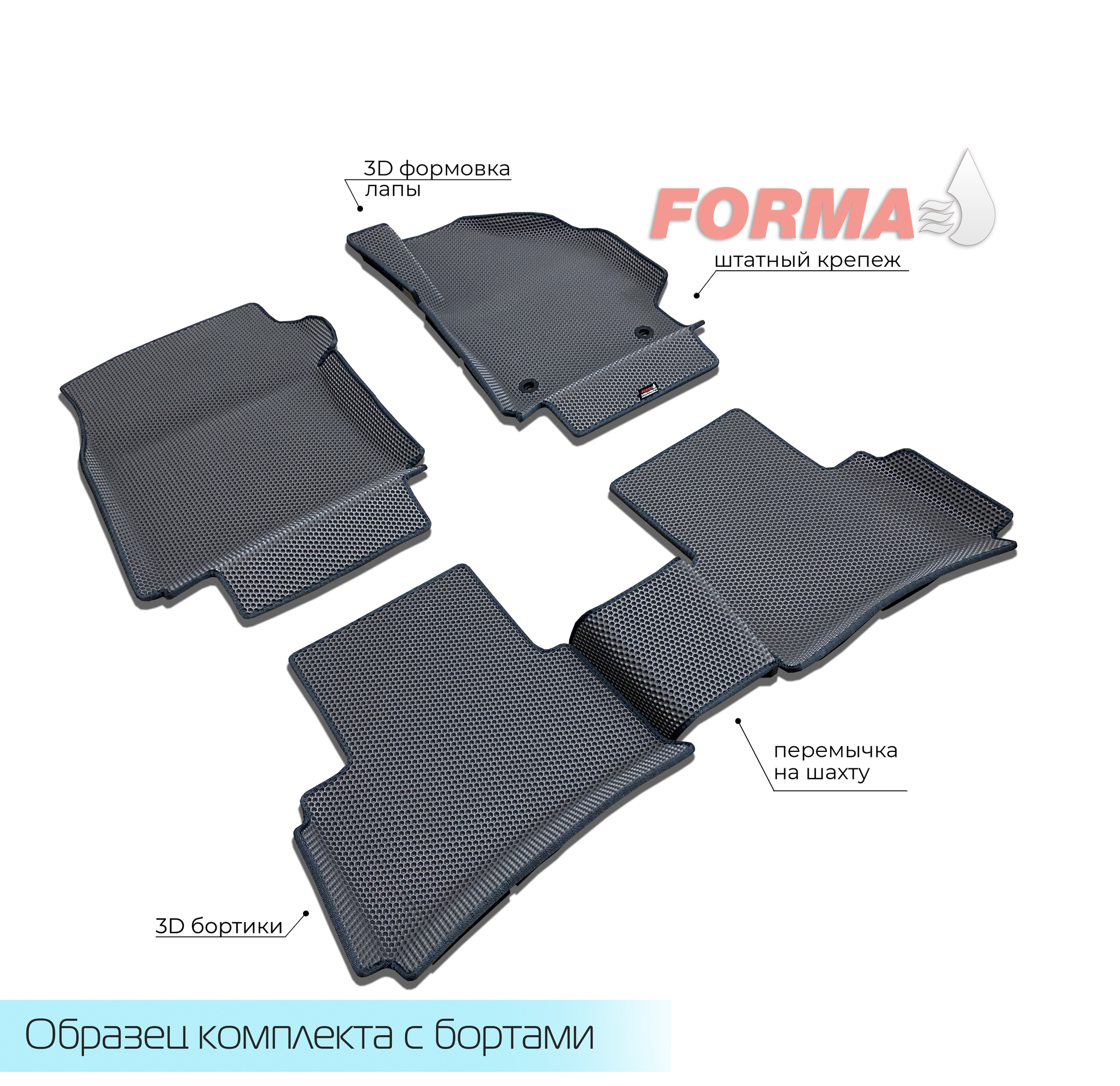 При производстве ковриков от компании FORMA, используются высококачественные сертифицированные материалы и свои собственные лекала, снятые непосредственно с автомобиля. Коврики надежно крепятся к полу при помощи липучек и штатного крепежа, при его наличии.