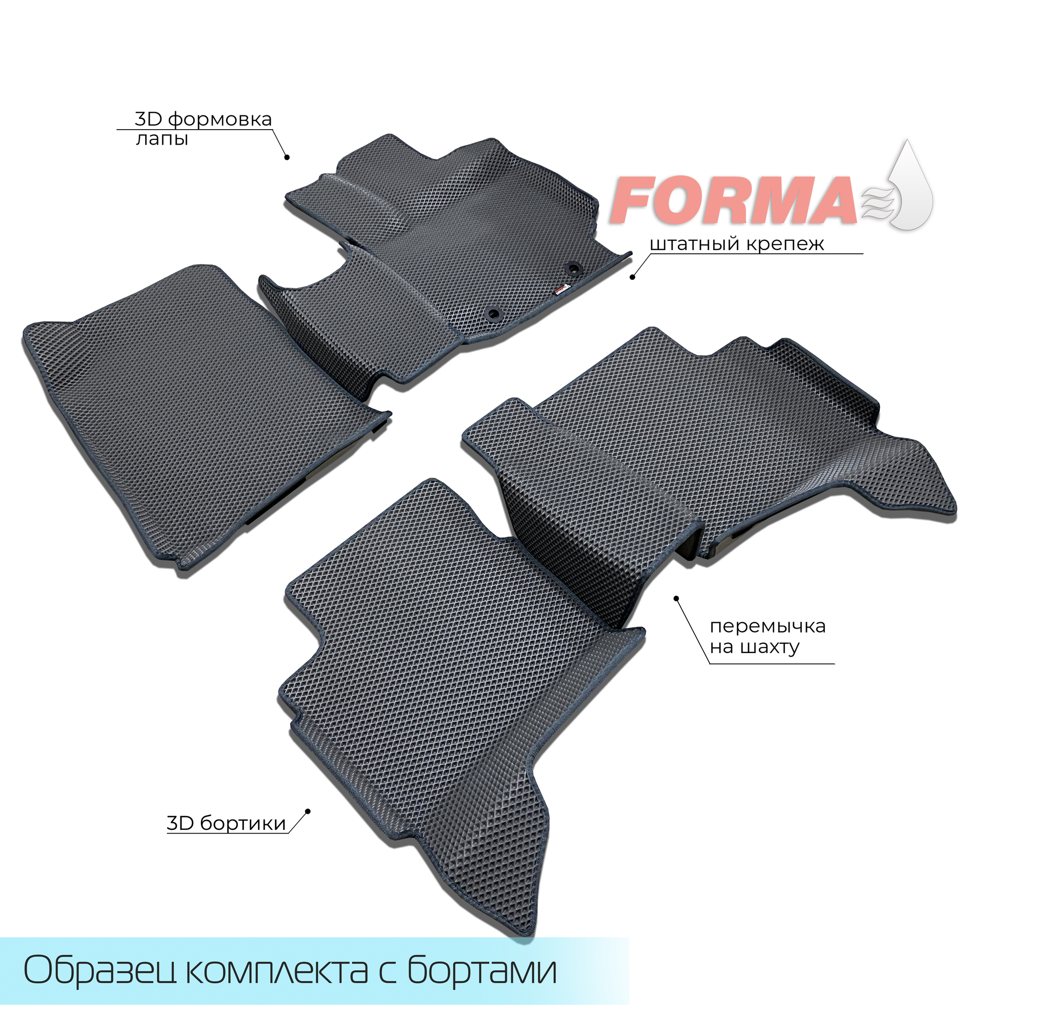 При производстве ковриков от компании FORMA, используются высококачественные сертифицированные материалы и свои собственные лекала, снятые непосредственно с автомобиля. Коврики надежно крепятся к полу при помощи липучек и штатного крепежа, при его наличии.