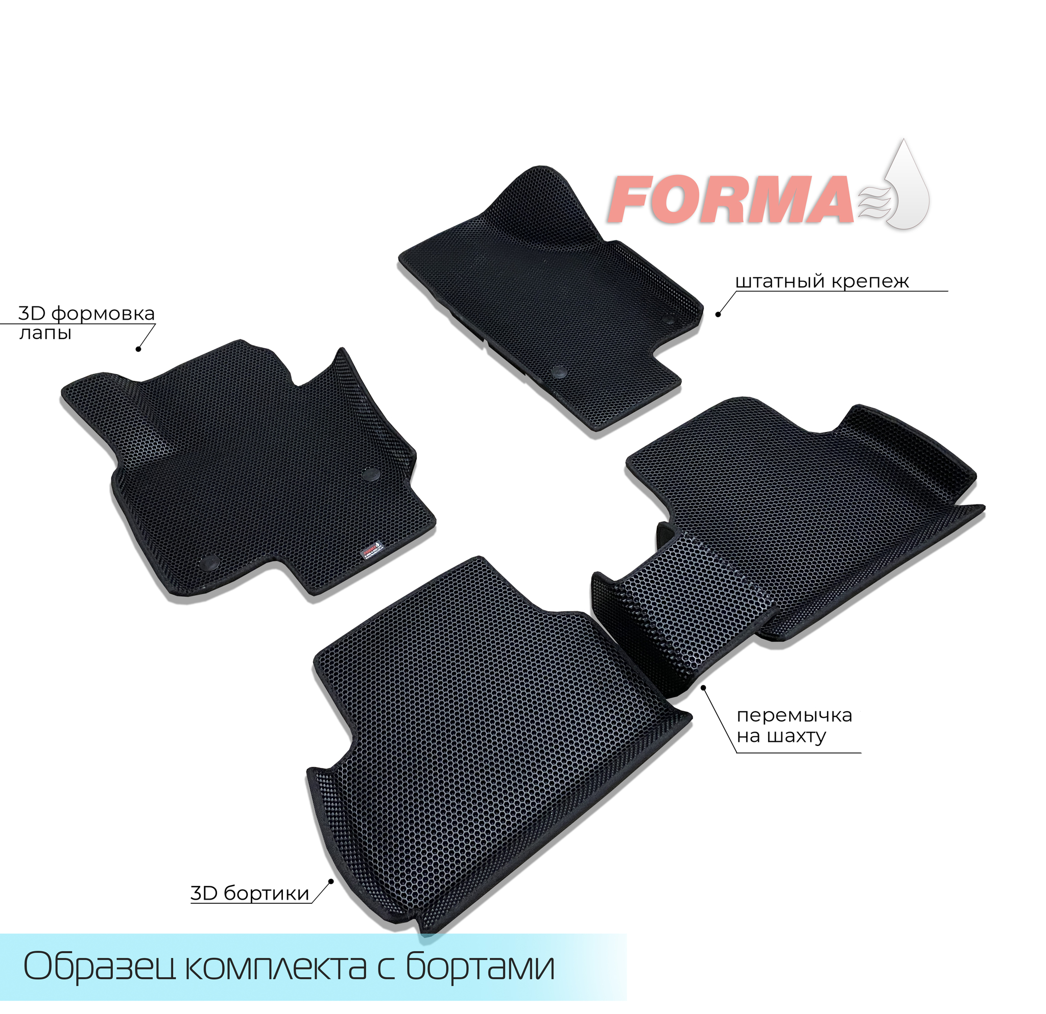 При производстве ковриков от компании FORMA, используются высококачественные сертифицированные материалы и свои собственные лекала, снятые непосредственно с автомобиля. Коврики надежно крепятся к полу при помощи липучек и штатного крепежа, при его наличии.
